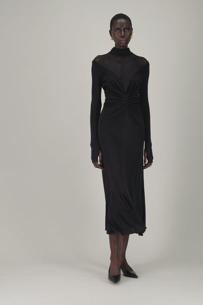 Abito in jersey di viscosa con inserti in tulle e dettaglio intrecciato sulla schiena, lunghezza midi e collo alto.
