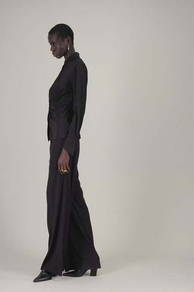 Pantalone scivolato in seta con gamba ampia e bottone automatico a pressione.