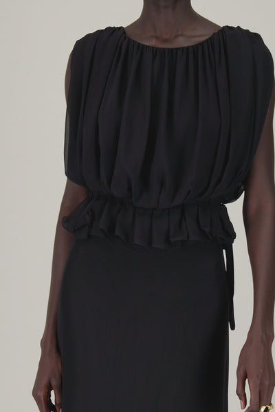 Top drappeggiato senza maniche in georgette di seta con coulisse laterale regolabile.