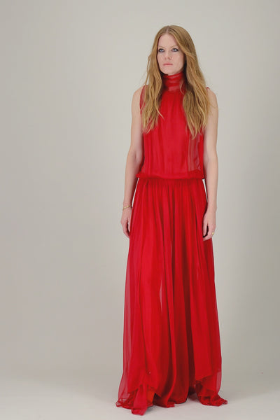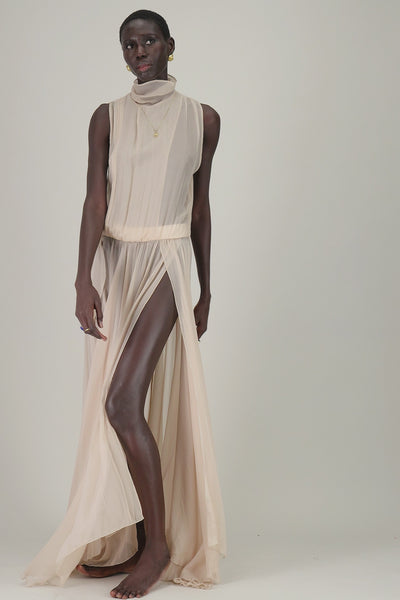 Abito lungo in chiffon di seta senza maniche con collo alto, scollatura sul retro a goccia, spacchi profondi ed elastico in vita per effetto blusante.
