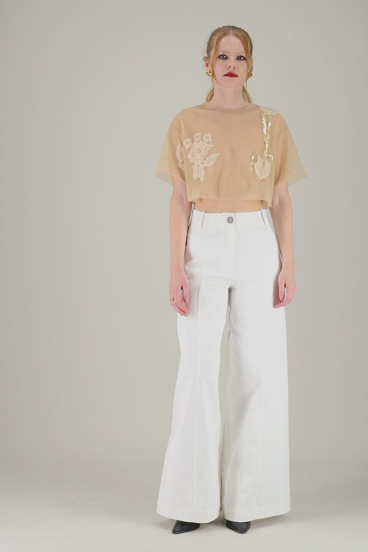 Jeans vita alta con cuciture sartoriali, con gamba ampia e stretto in vita.