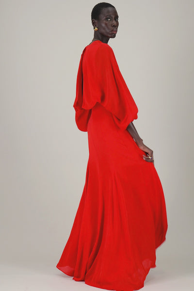 Abito lungo fluido dal taglio svasato in seta con scollo profondo a V, effetto mantella sul retro e manica ampia con polsino elasticizzato.