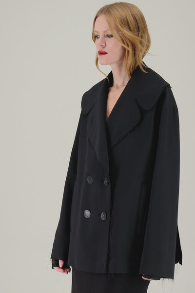 Giacca caban doppiopetto in viscosa con revers ampio, dettagli taglio vivo e occhielli a vista sul retro.